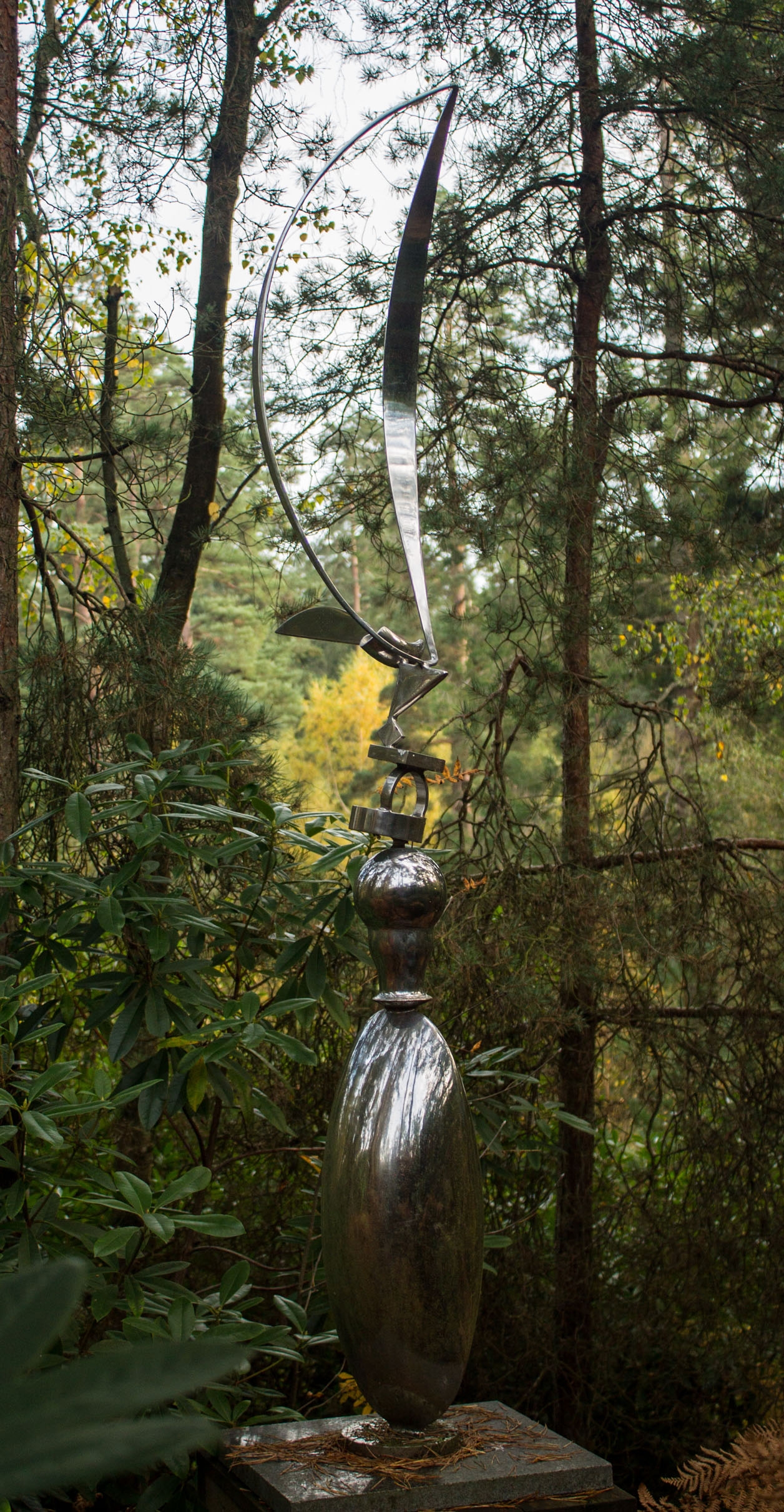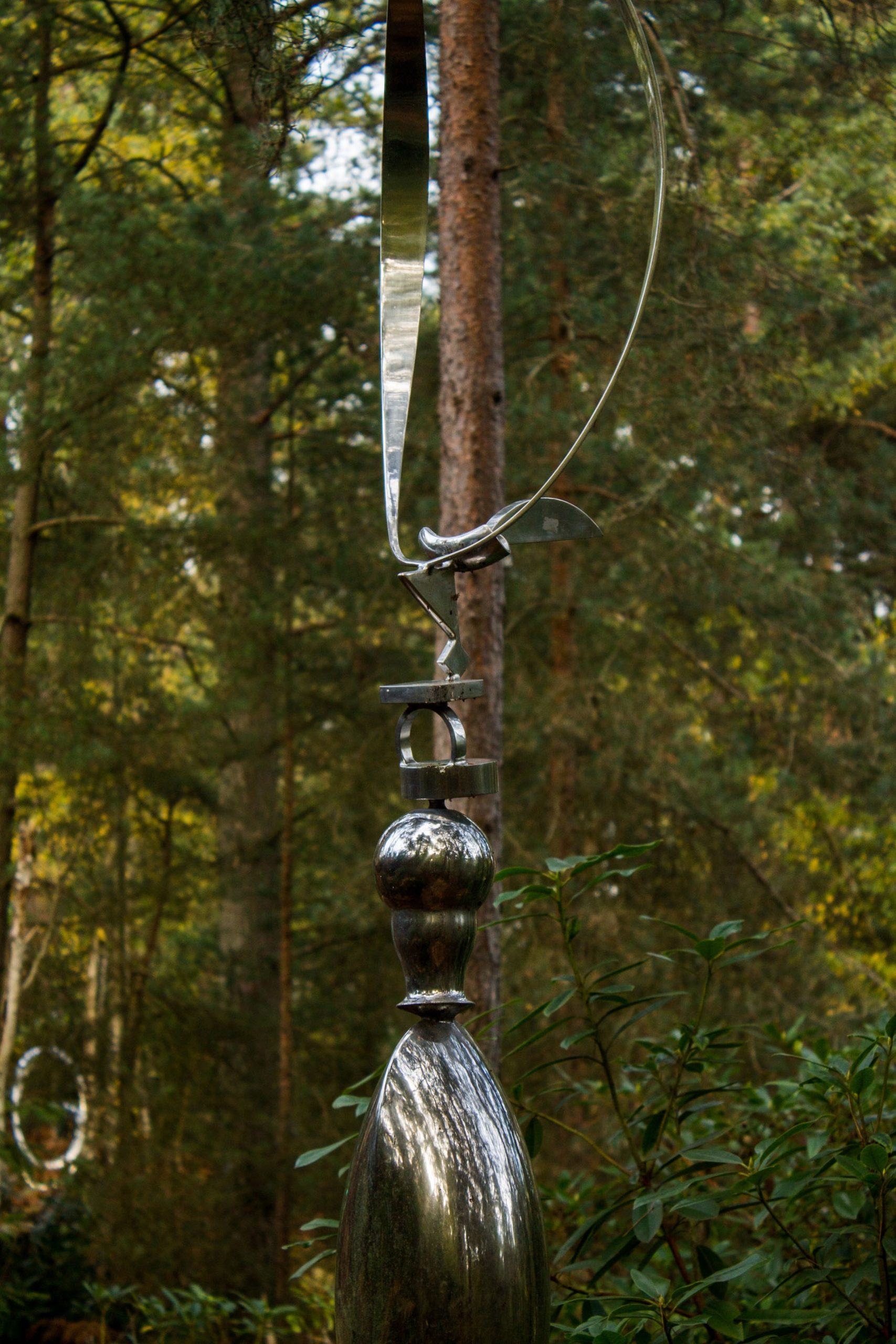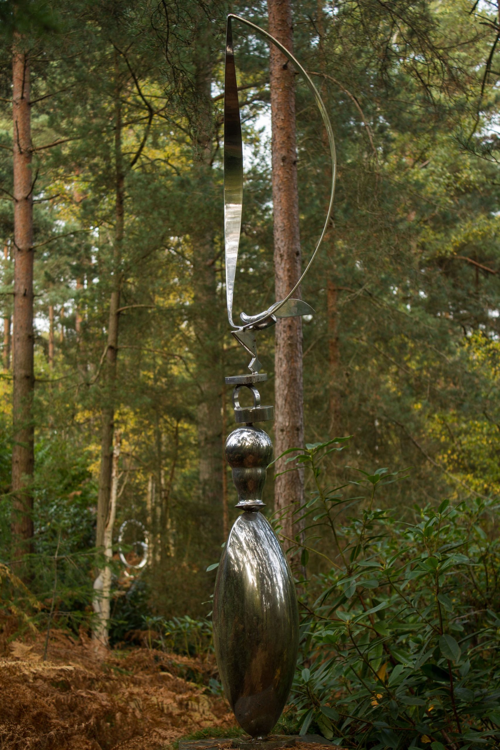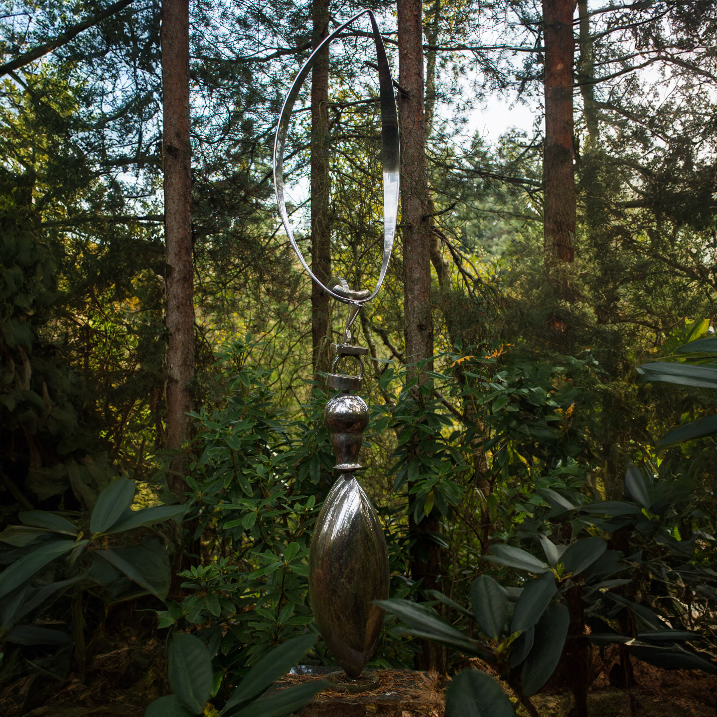 The sculpture rises from a narrow base, beginning with a series of rounded, elegant shapes. These forms flow upward, gradually tapering into smaller hollow structures. At the top, a large bent hoop rests, completing the composition with a sense of balance and poise. The reflective steel surface enhances the piece, catching light and creating shifting highlights across its curves.