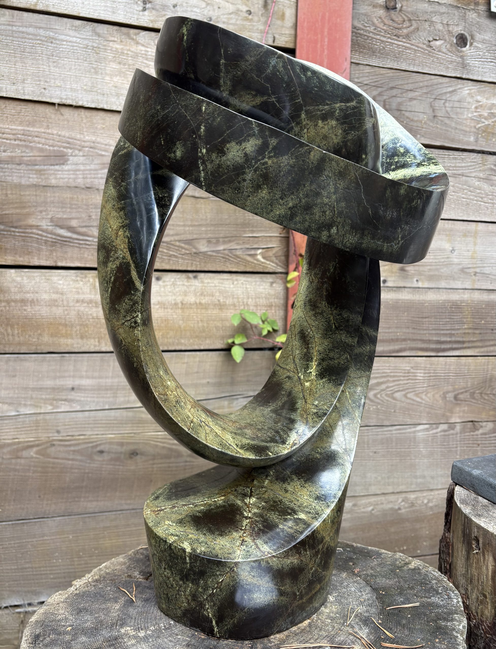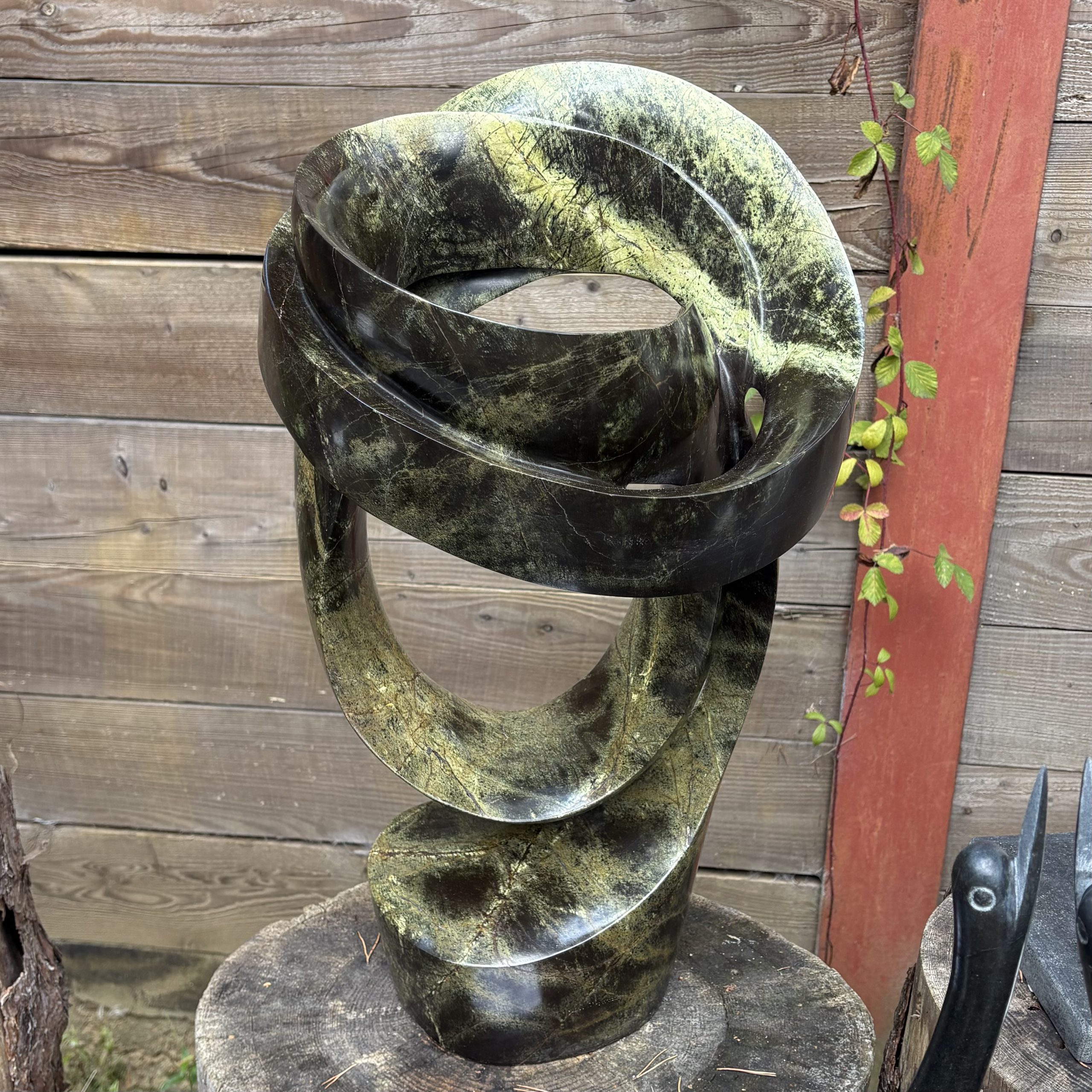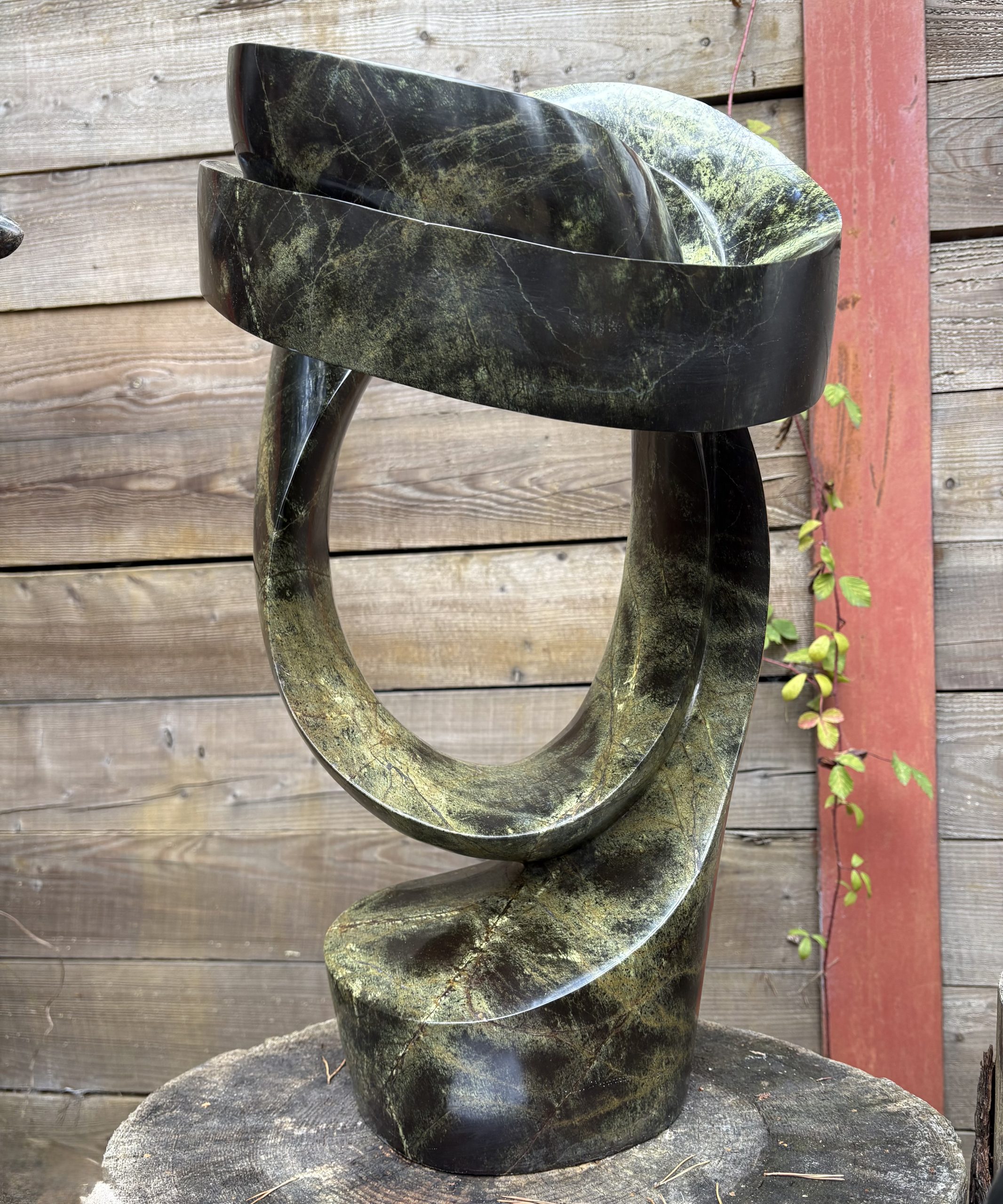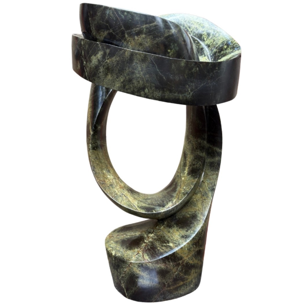 Bopoto’s skillful carving transforms the dense, dark-green avocado stone into smooth, polished surfaces that catch the light. This emphasises the gentle undulations and rounded edges of the piece. The sculpture’s abstract composition suggests forces in a delicate, intertwined relationship and so hints at emotional and spiritual bonds without resorting to literal representation.