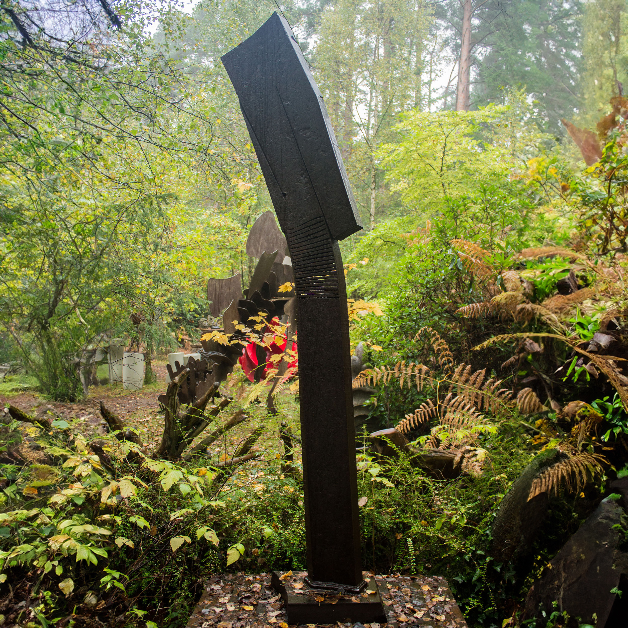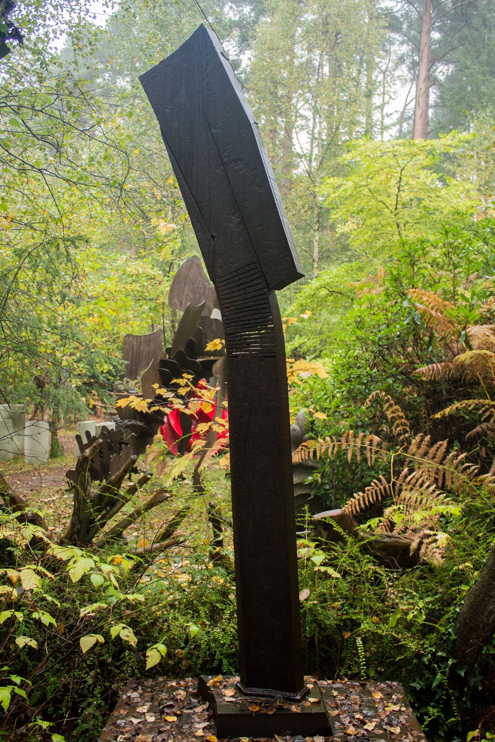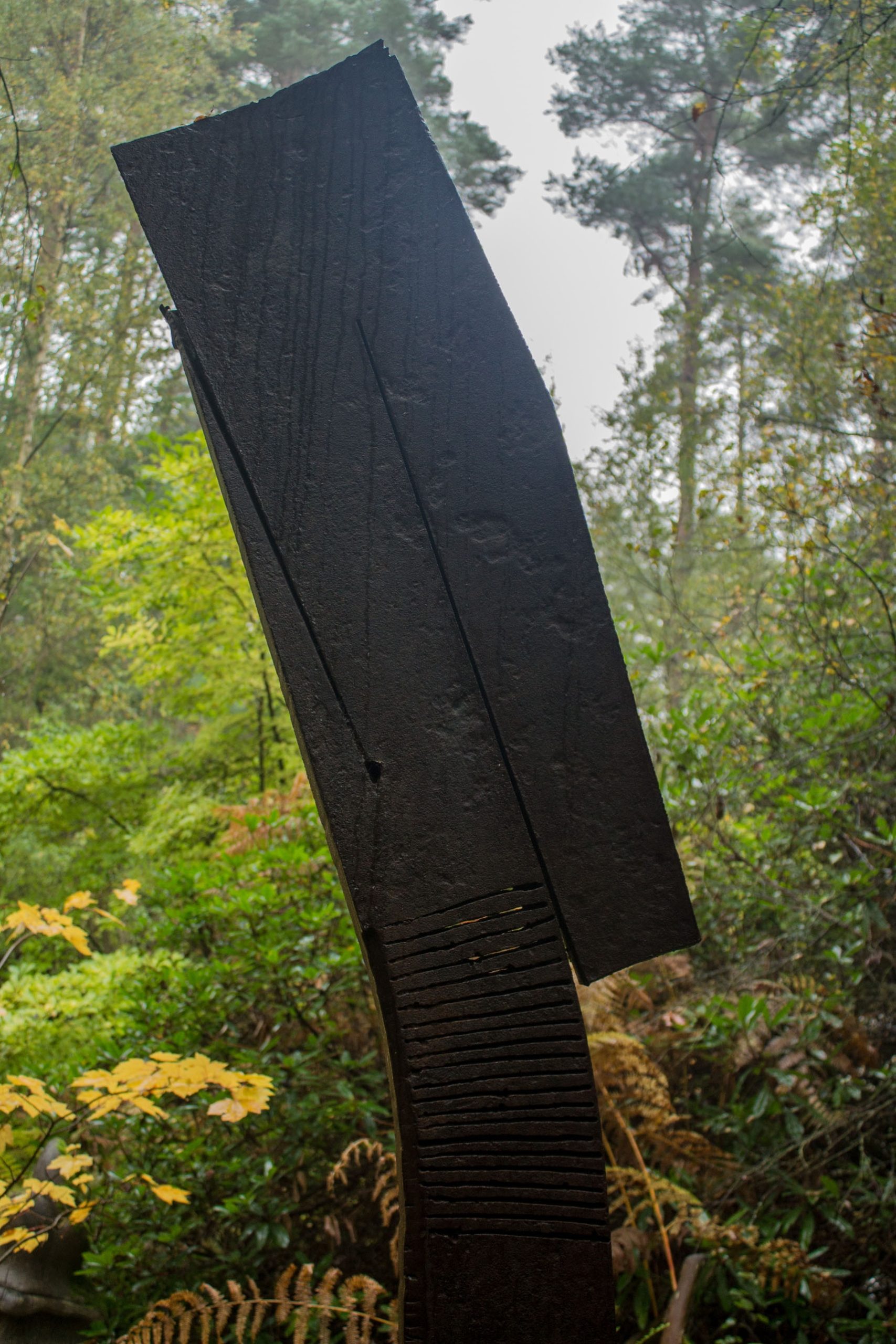 The sculpture rises vertically with flat, clean edges, giving it a commanding presence. Near the top, the form widens slightly, creating a subtle sense of weight and balance. Several cuts pierce the steel in this upper section, allowing the form to bend and shift gently. These incisions create tension, as if the metal is simultaneously held together and pulled apart.