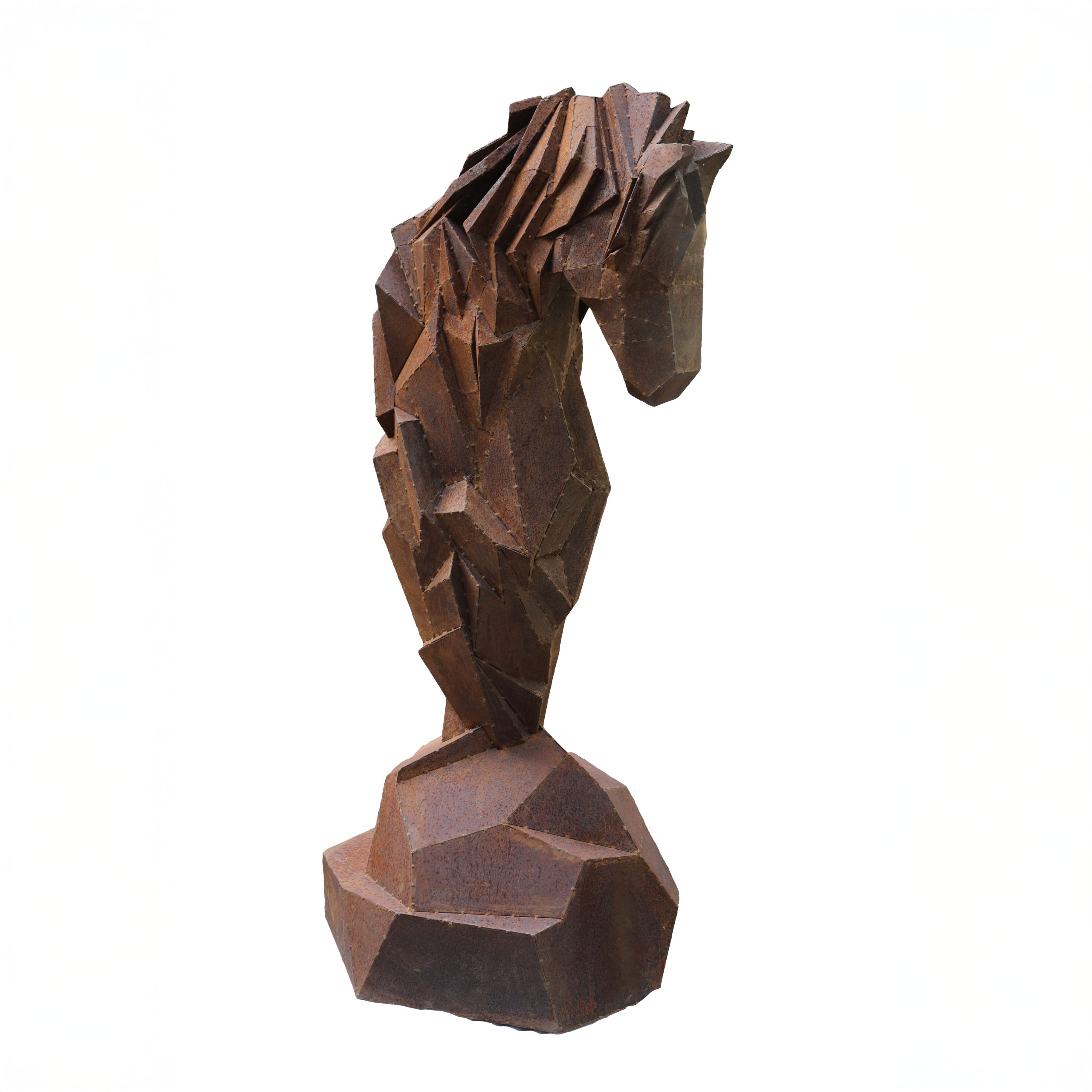 This piece is a powerful abstract sculpture in Corten steel, measuring 175 cm high, 75 cm wide, and 70 cm deep. The work depicts a horse’s head mounted atop a mound, yet it avoids realistic representation. Instead, Bayardo simplifies the form, constructing the head from several steel planes welded together. Bolt-like joins line the edges, creating a jagged, industrial effect.