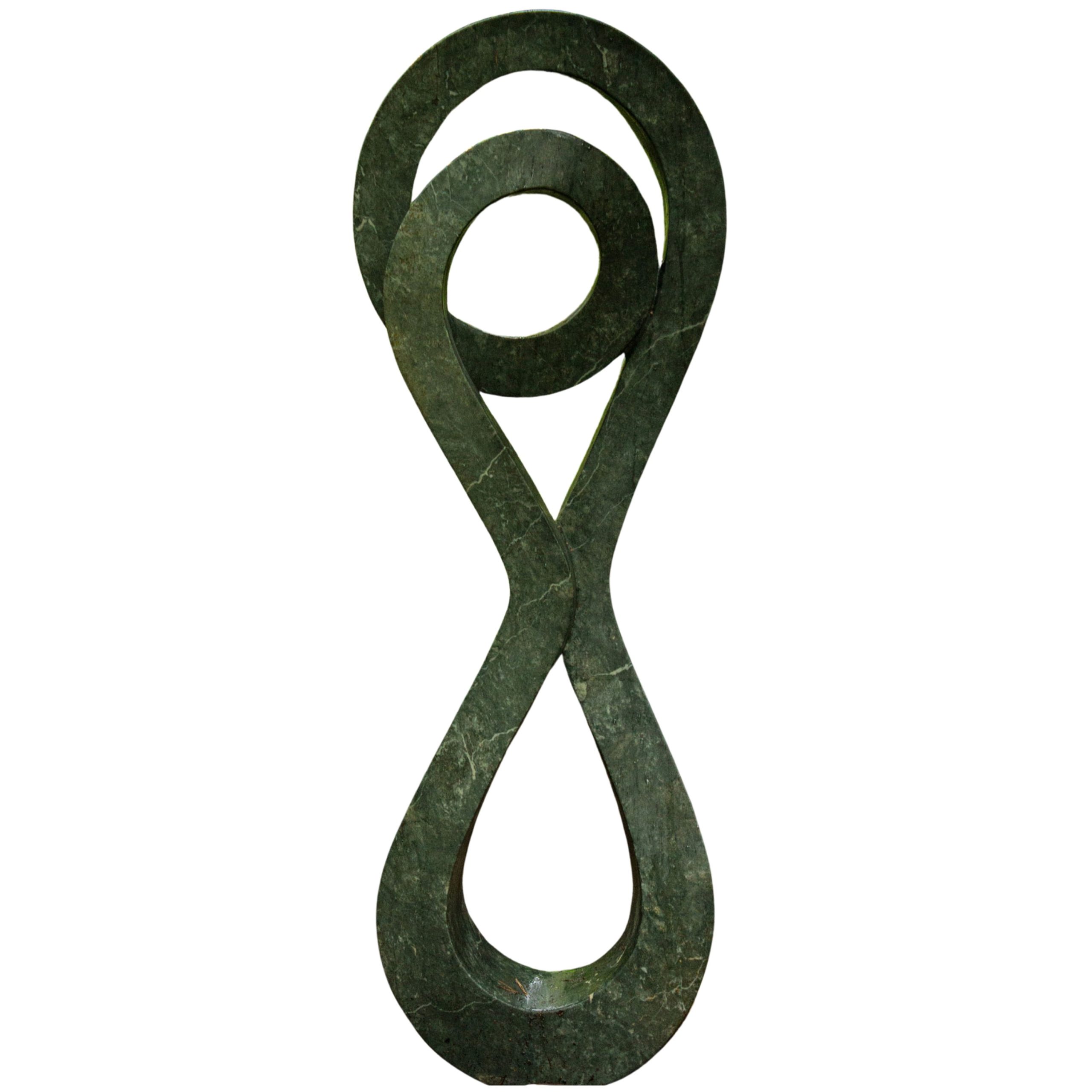 The entire surface is carefully smoothed and polished, highlighting the natural beauty of the green stone. Light glances off the polished areas, emphasizing the sculpture’s curves and giving it a subtle glow. The interplay of shape and surface draws the eye along its continuous flow, reinforcing the idea of infinity.