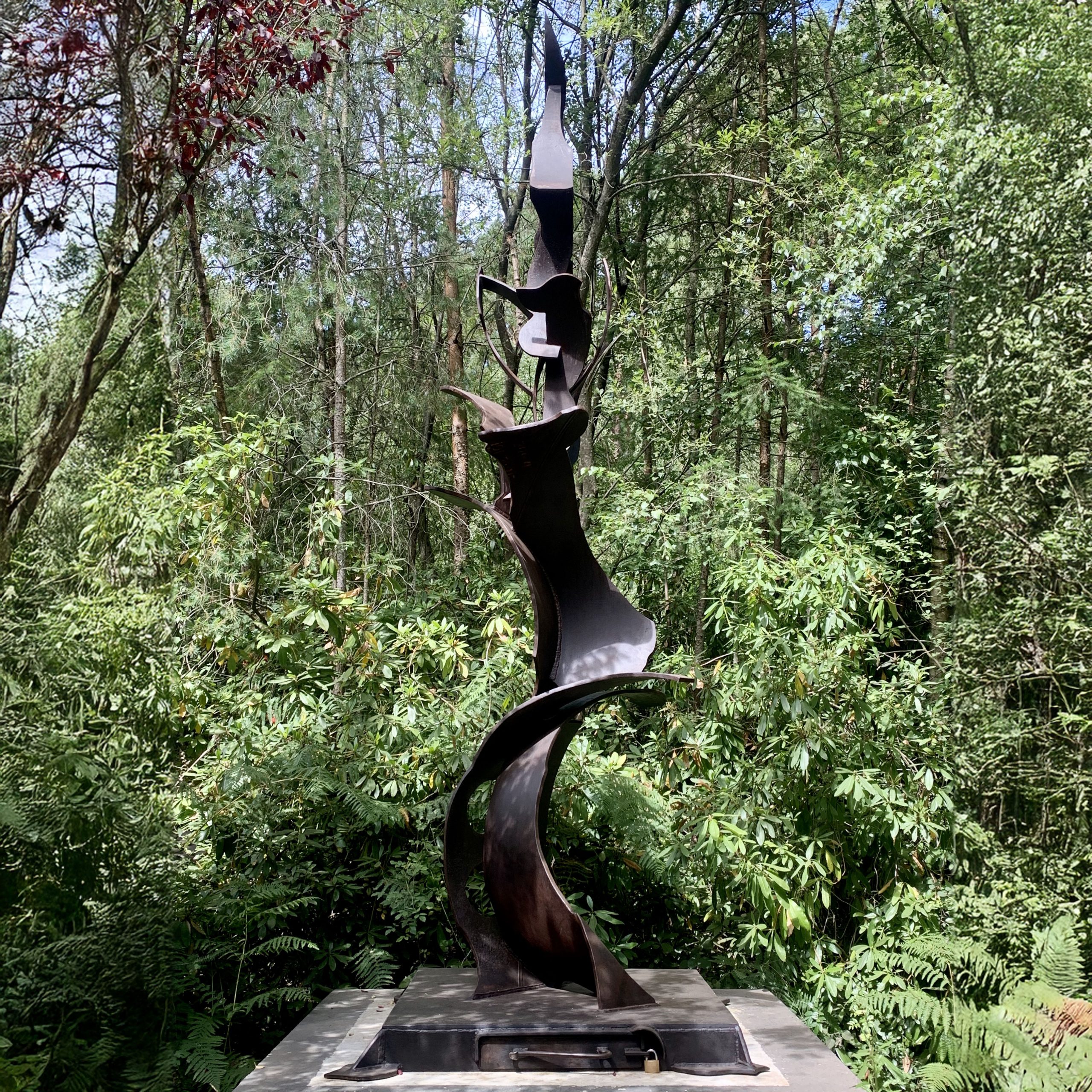 This piece by Mark Goodchild, is a bold and expressive abstract sculpture crafted from cut steel sheets. Towering at 510cm high, it commands attention with its powerful presence and dynamic form. The structure bends and curves dramatically, creating a sense of tension and movement as it twists upward and outward.