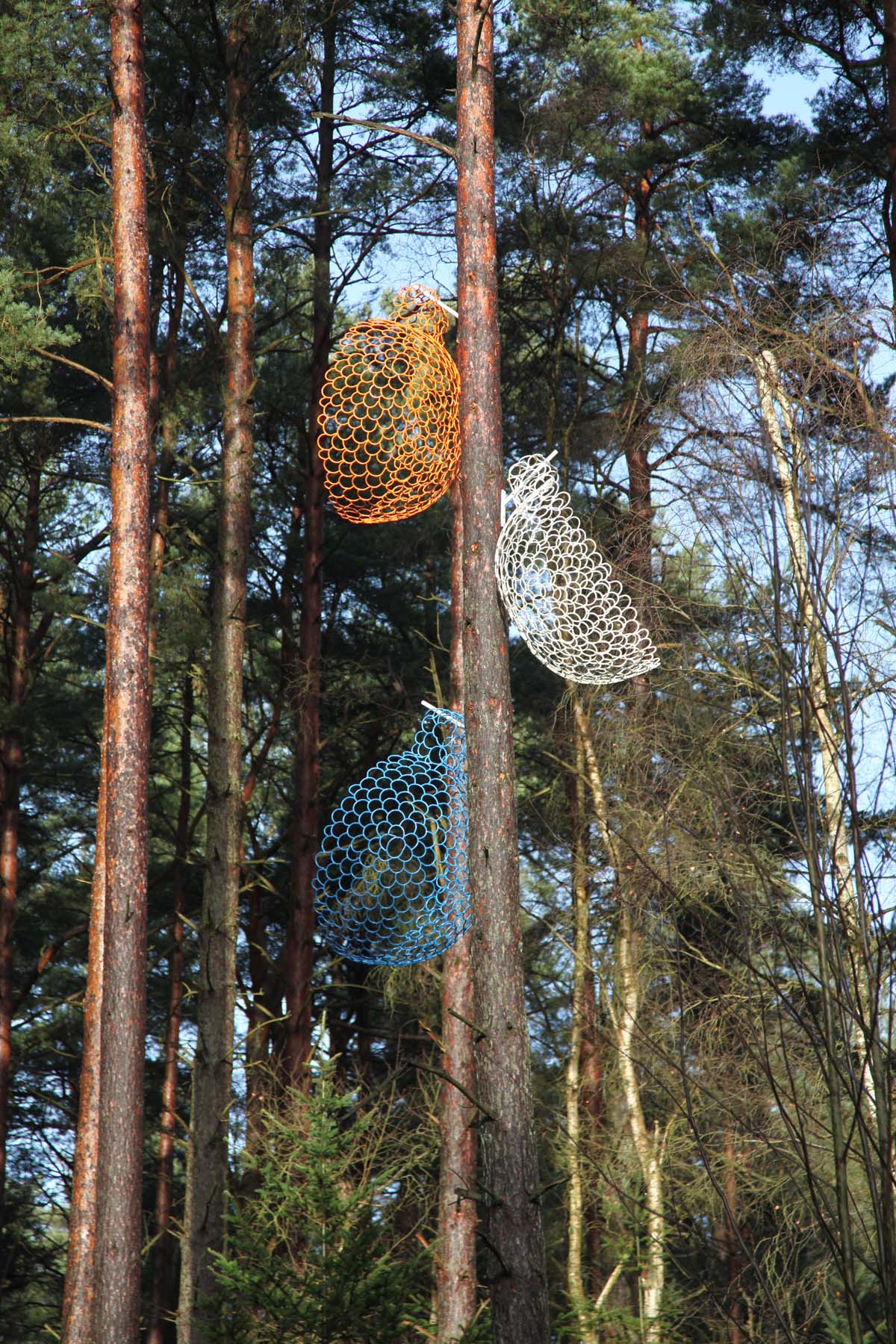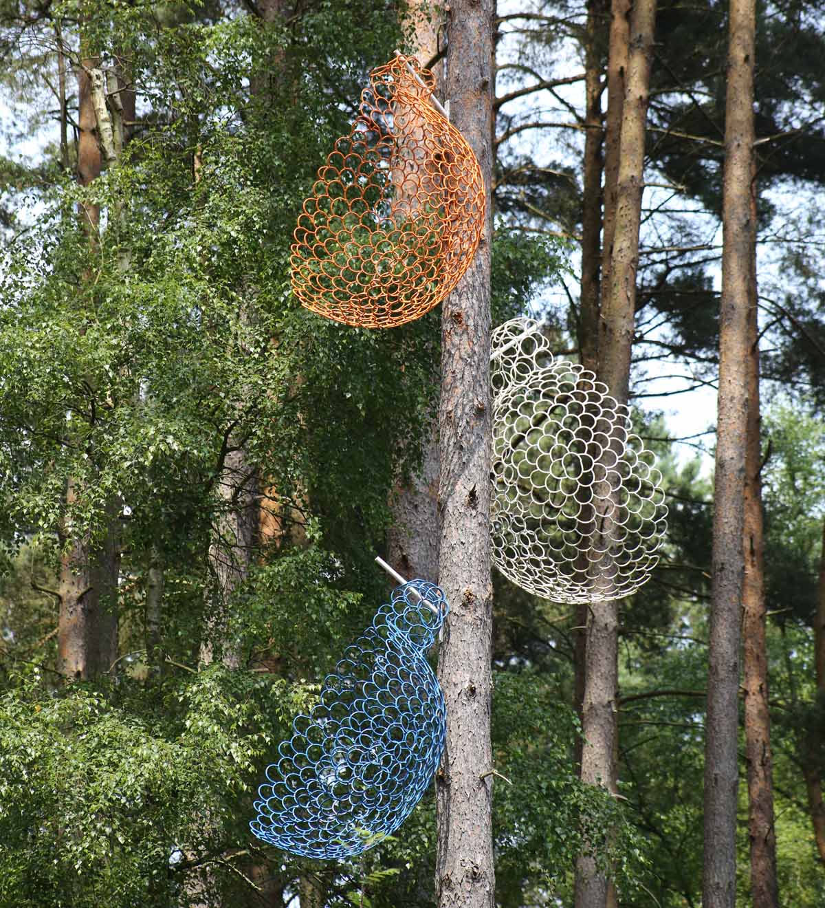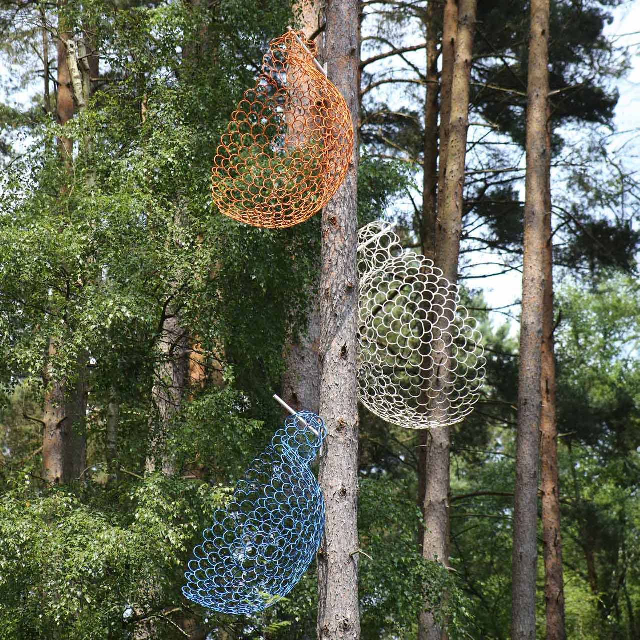 Each cup in the set is a different colour, white, orange, and blue, adding vibrancy to the piece. While the cups share the same construction method, they vary slightly in shape and size, creating subtle distinctions between them. The fluid, minimalist design evokes a sense of movement as the cups seem to float in mid-air.