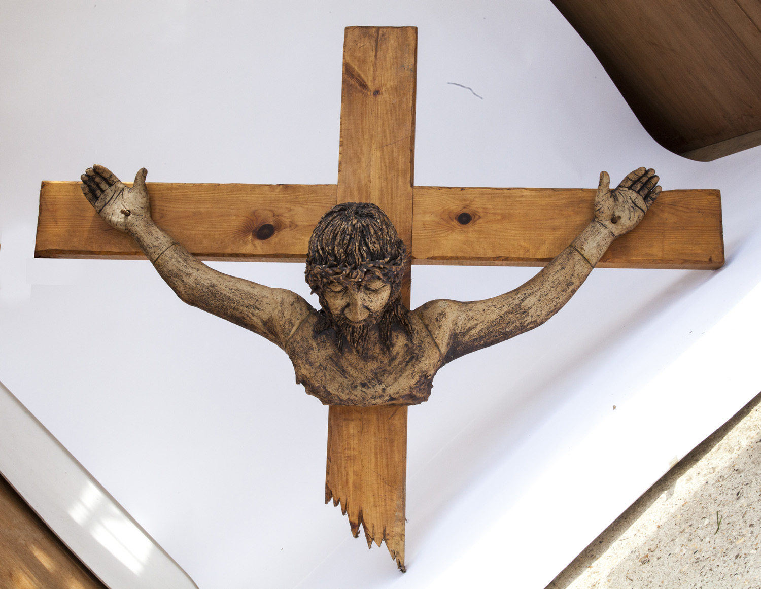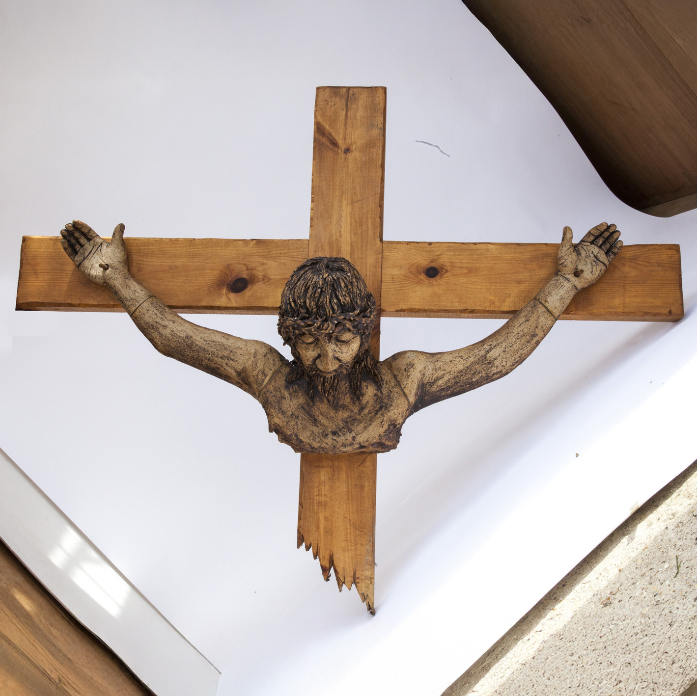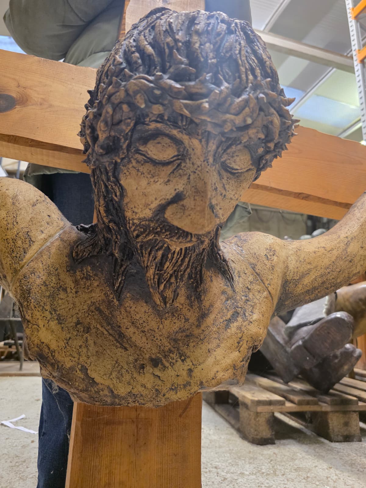 Christ Crucified on the Cross by Pat Kaye, Stoneware, Wood, Unique, 125cm high