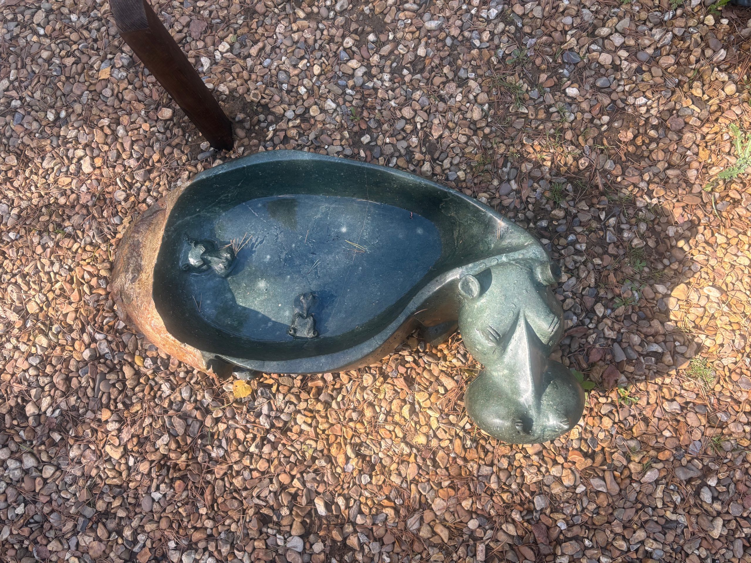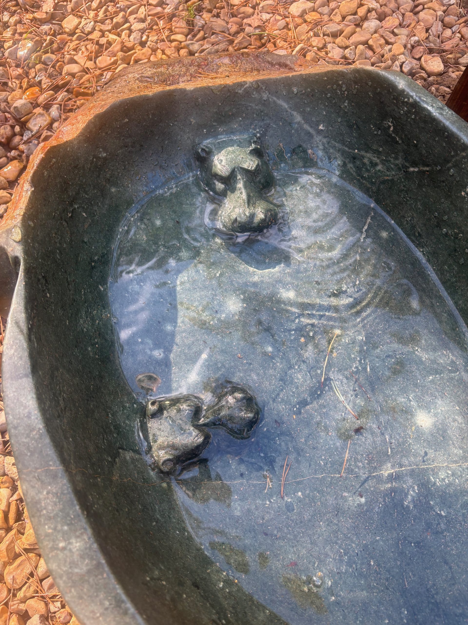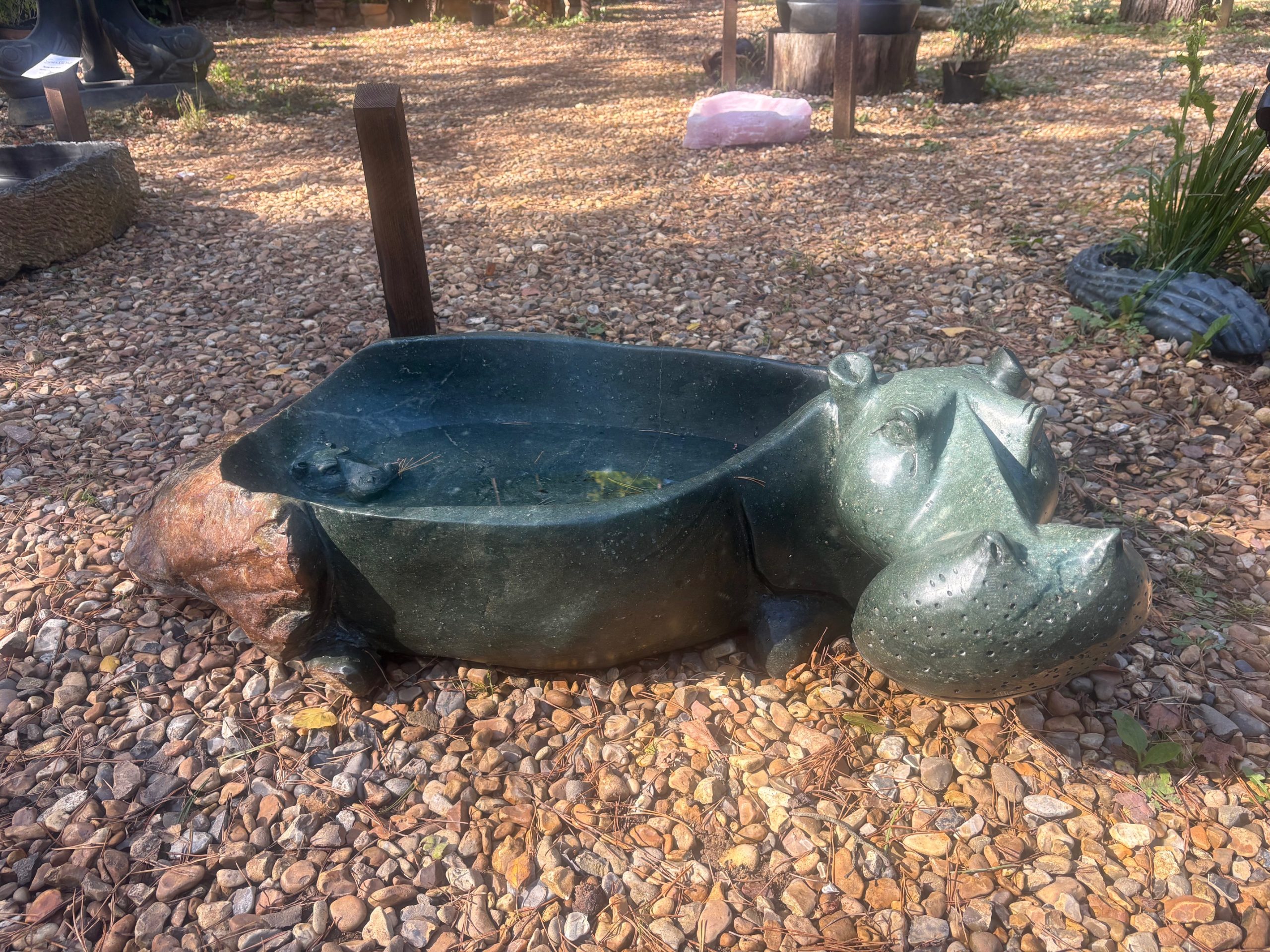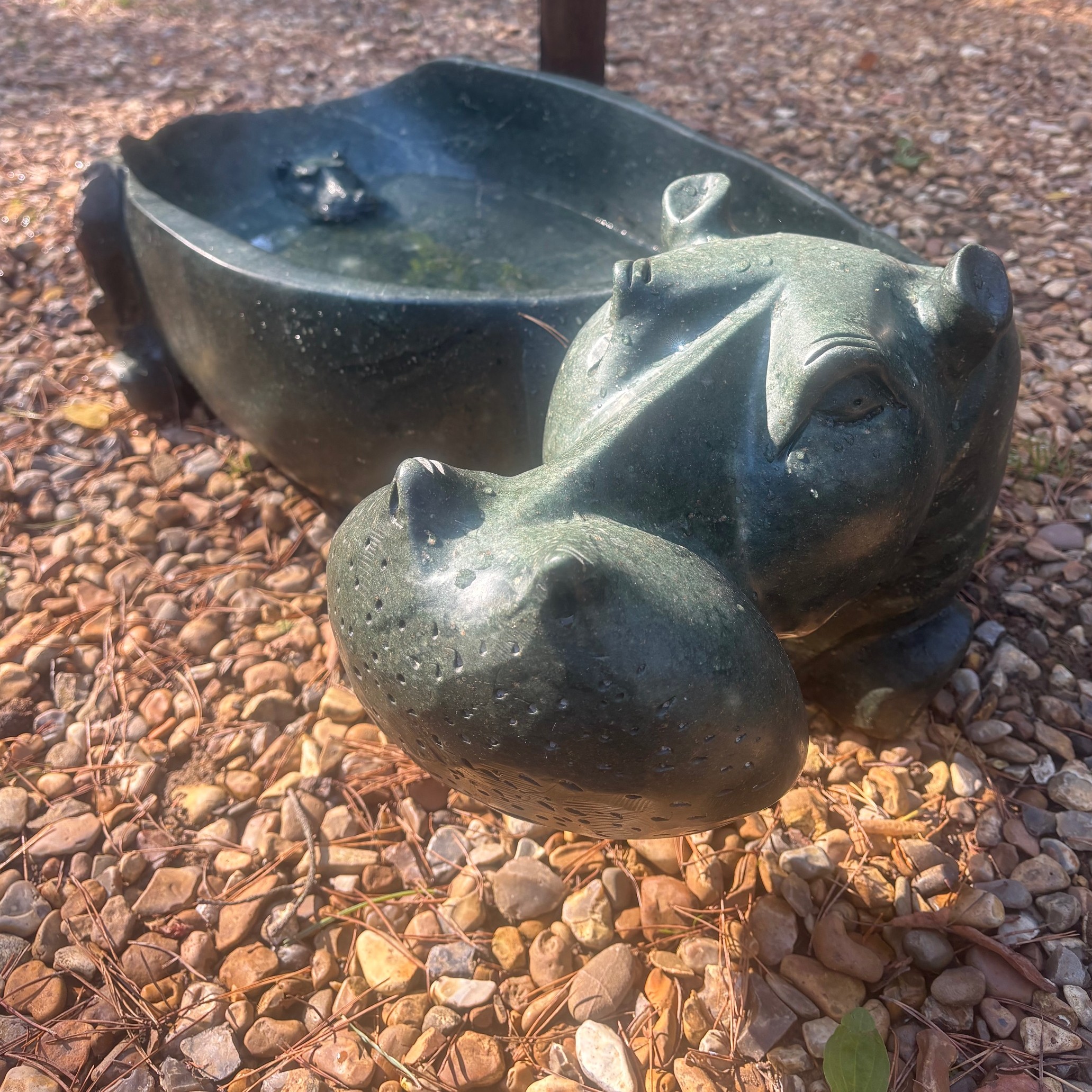 The most striking feature of the sculpture is the hollowed back of the hippo. The back is carefully carved out, with a slight slope at the rear end, forming a functional bird bath. Two smaller hippo heads are placed within the basin, appearing as if they are submerged in water. This clever design adds a playful touch, making the piece both visually interesting and functional.