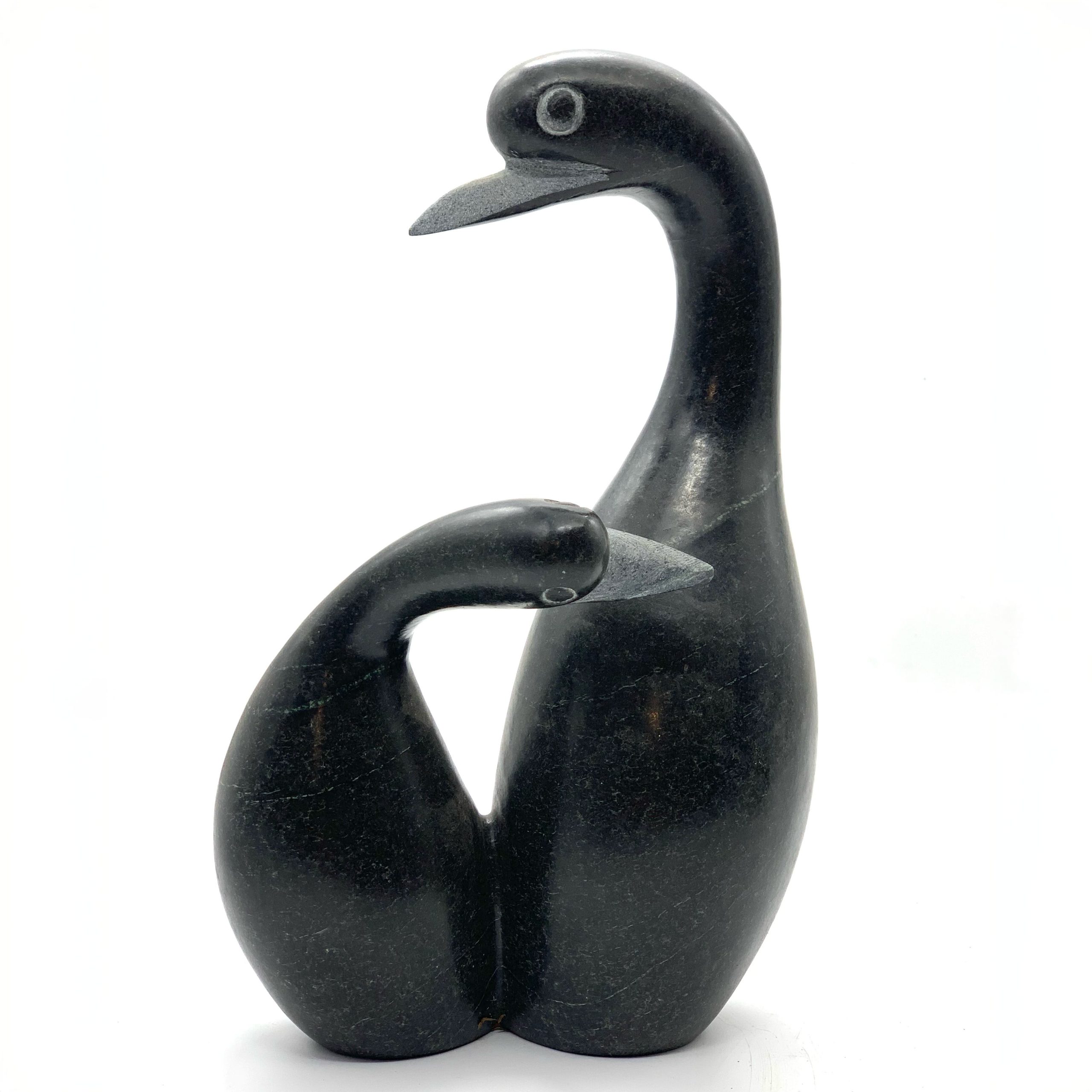 The smooth, polished surfaces highlight the flowing lines of the figures. Curves merge seamlessly, giving the sculpture a sense of unity and calm. Light glides across the dark Springstone, accentuating the gentle arc of the smaller bird’s head and the vertical strength of the larger form. Despite its simplicity, the interaction between the two birds conveys warmth and intimacy.