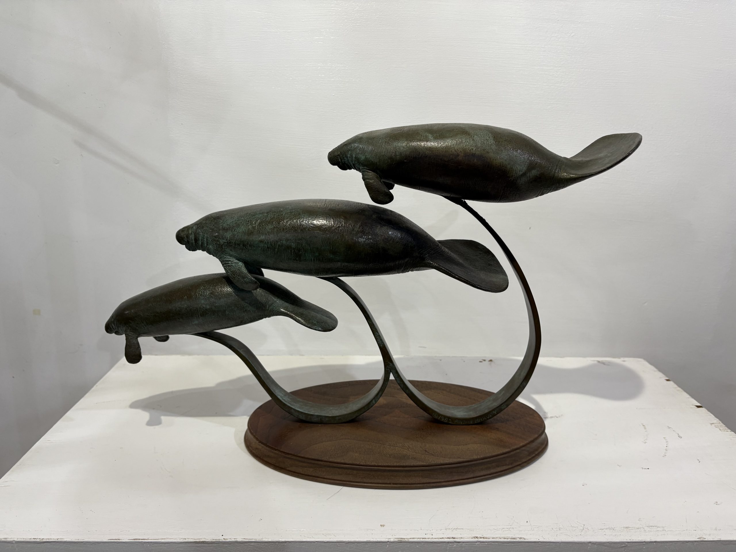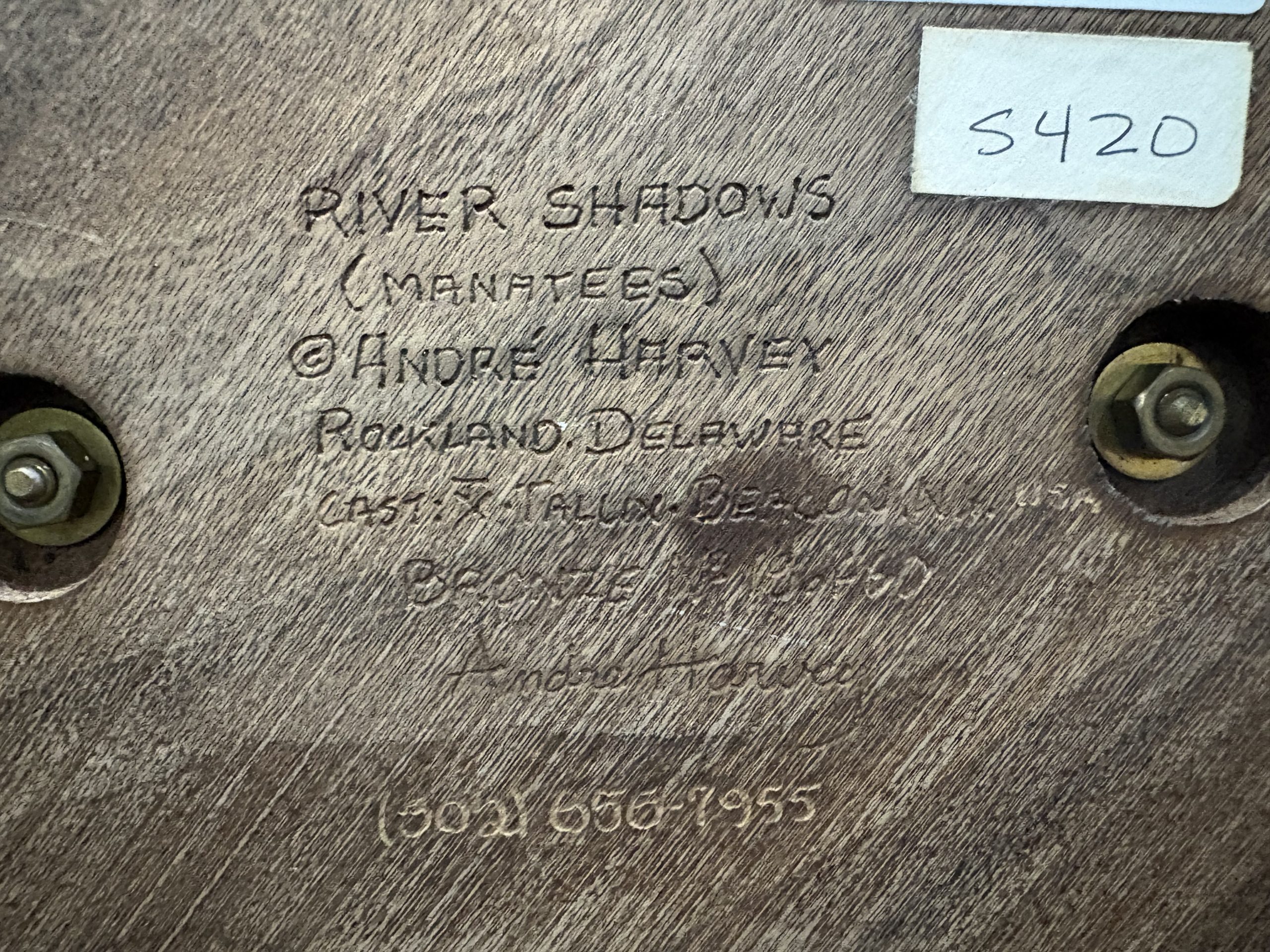 River Shadows (Three Manatees) by Andre Harvey. Bronze on wooden base, Edition Signed 1982. 35cm high, 53cm wide, 18cm deep , Animal, Bird, Figurative, Kinetic, Nature, Nautical, Seal, Whale, Green, Water Creatures sculpture