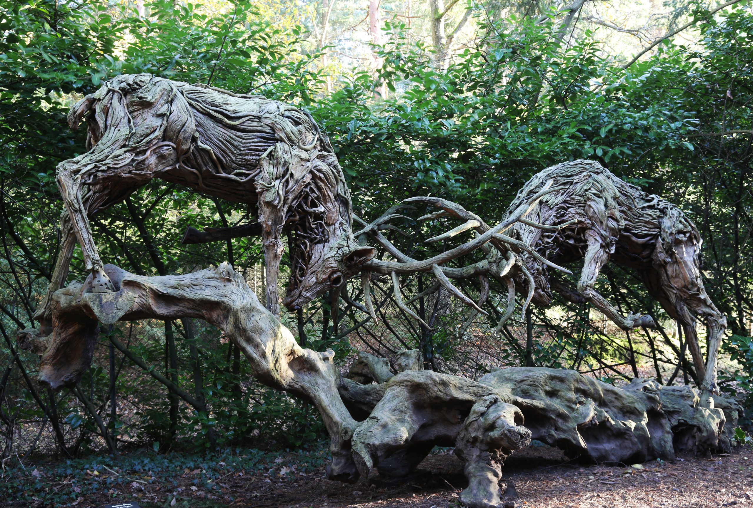 A steel and wood sculpture of a pair of stags fighting each other. With their heads down and antlers interlocked they are ready battle.