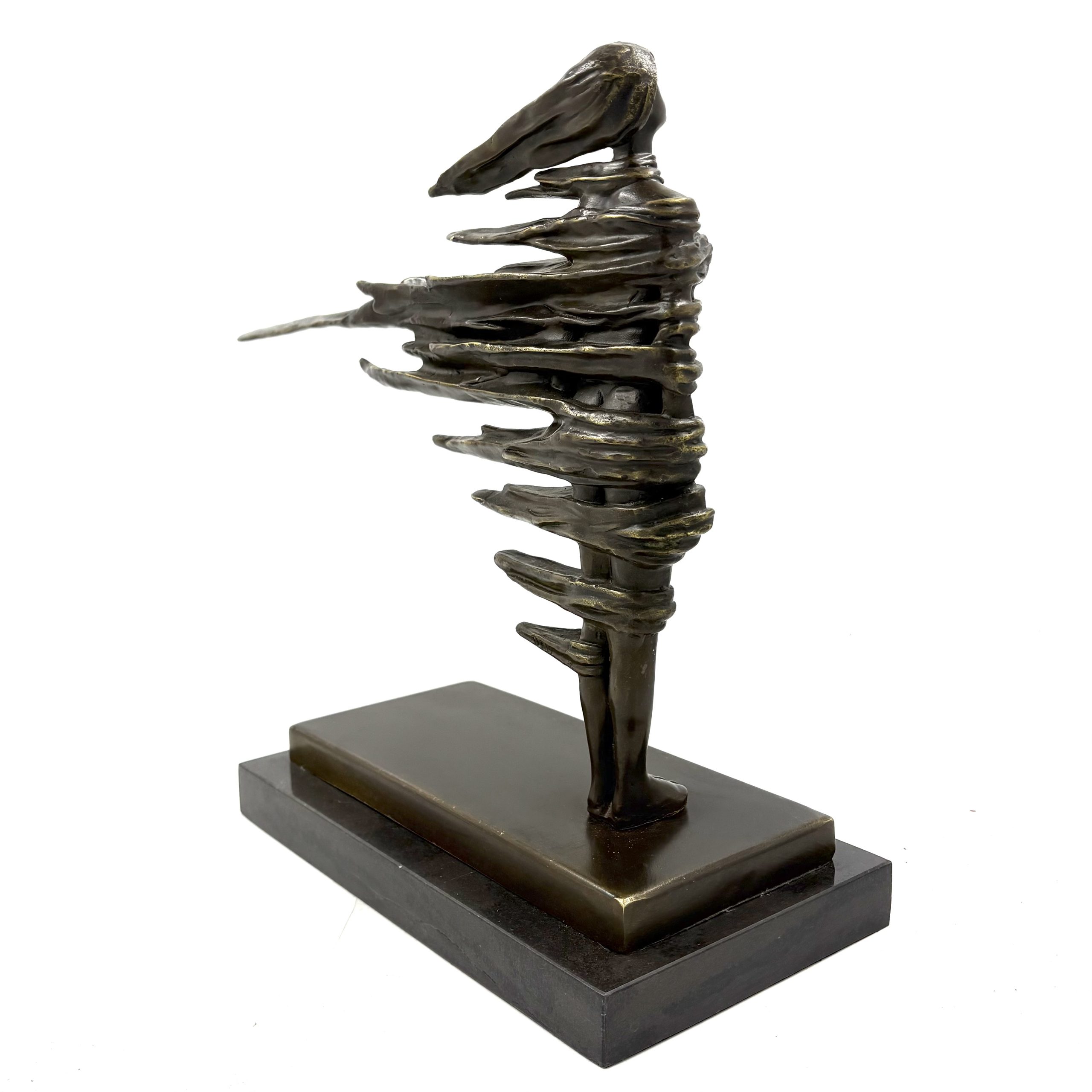 The figure is mounted on a solid marble base, providing a refined contrast to the organic, expressive lines of the bronze and ensuring both stability and visual balance. Measuring 36cm high by 40cm wide by 16cm deep, the piece makes a bold statement while remaining versatile enough for display on a console table, shelf, or pedestal.