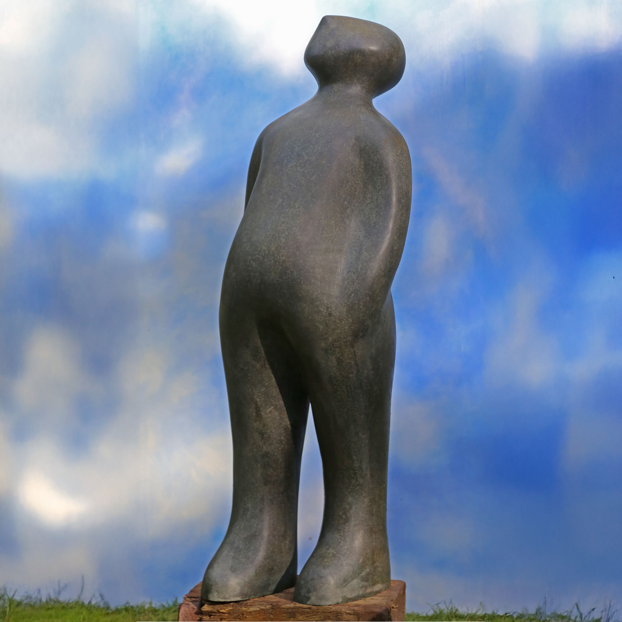 The Large Visitor by Guido Deleu is a striking figurative bronze sculpture that captures the quiet intensity of human introspection. Standing at 150 cm, this imposing figure draws the viewer’s gaze upward, as if contemplating the vastness of the sky and the mysteries of existence. With no defined facial features, the sculpture evokes universality, inviting each observer to project their own emotions and reflections onto the piece.
