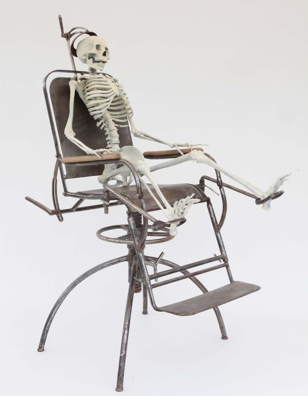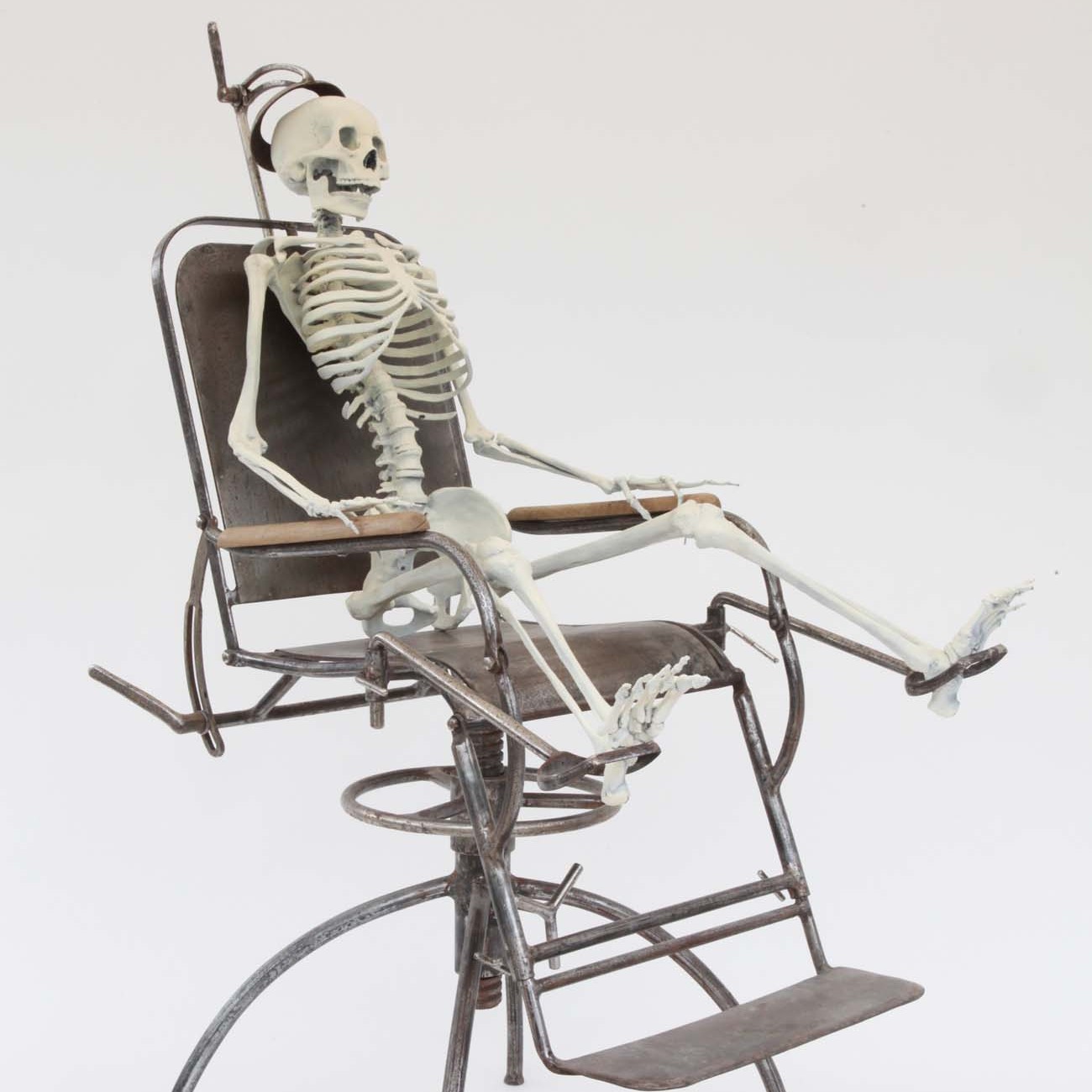 Birthing Chair by Wilfred Pritchard. Sculpture of a realistic looking bronze skeleton sitting in an antique birthing chair.